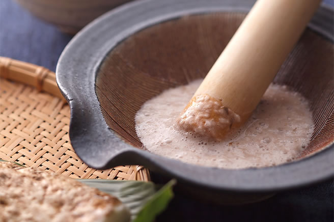 松之山のとろろは、もちろん天然の自然薯。長くまっすぐに伸びた自然薯の姿は一見の価値がありますが、これがなかなか手間のかかる食材なのです。自然薯は、成長過程で表面に付いた傷から細菌が入ると形がいびつになるのだとか。まっすぐ育てるには、こだわりの土と、細菌が入るのを防ぐという手間がかかるため生産数が少なく、当初は各お宿が毎日朝ごはんで提供するだけの必要量が揃わないかもしれないという心配もありました。しかし、十日町の自然薯をつくる農家さんのご協力により実現! 地域の生産者との連携によって結実した朝ごはんです。