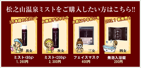 長女が「松之山温泉ミスト80g」、次女が「松之山温泉ミスト200g」、三女が「松之山温泉フェイスマスク」、四女が「松之山温泉入浴錠」と申します。