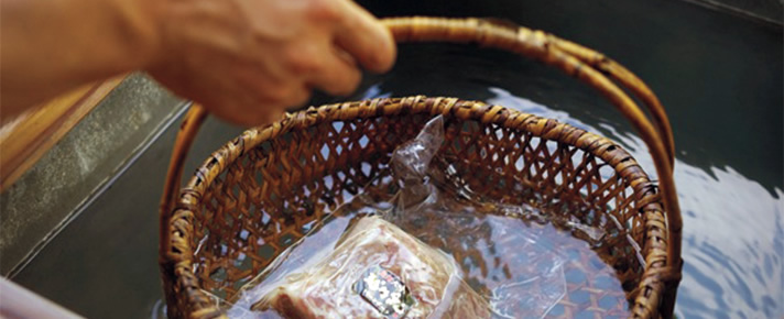 松之山温泉の「高温温泉釜」。ここに特産ポーク「妻有ポーク(真空パック入り)」を入れて約2時間、しっとり柔らかな温泉ローストポーク『湯治豚』の出来上がり~!